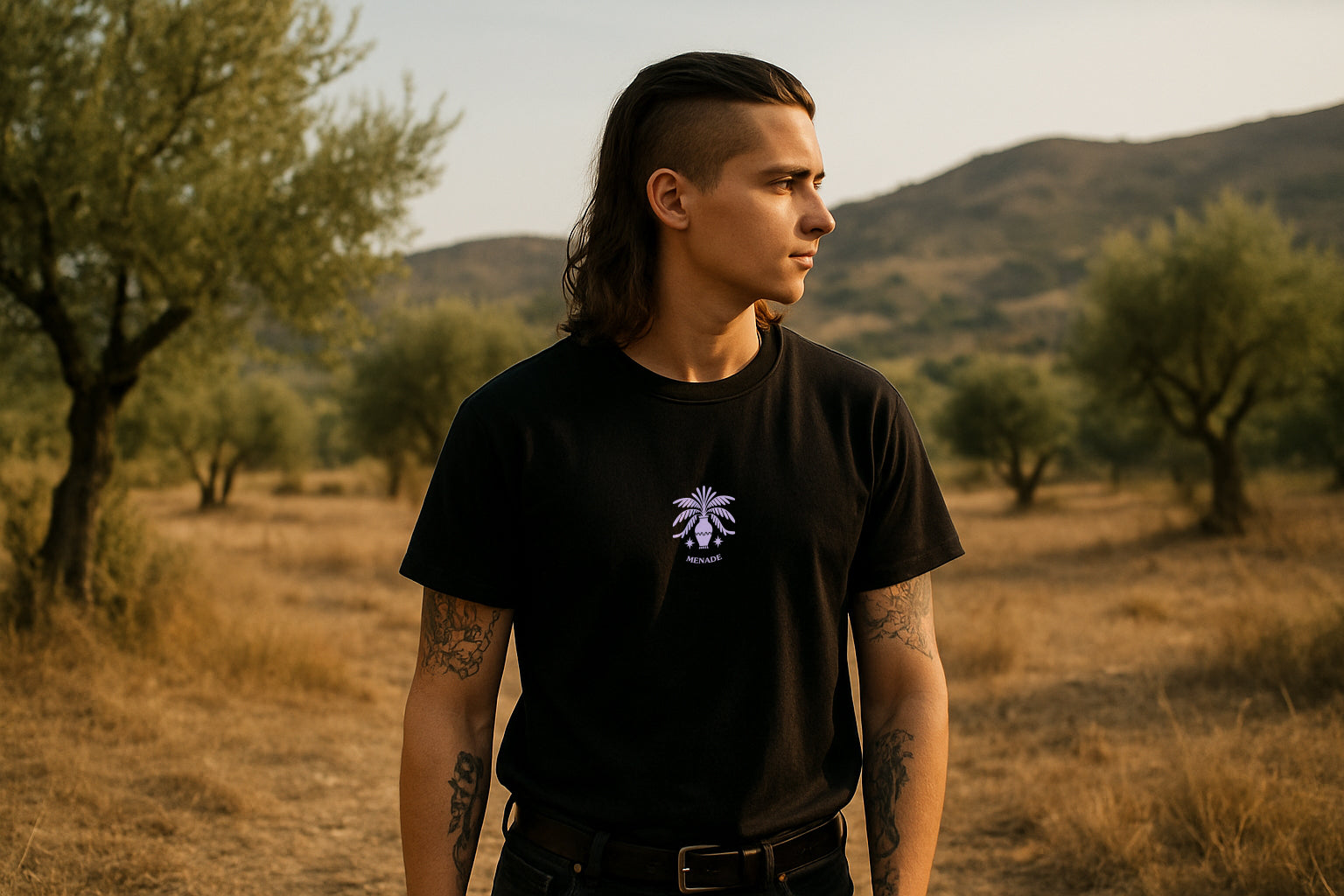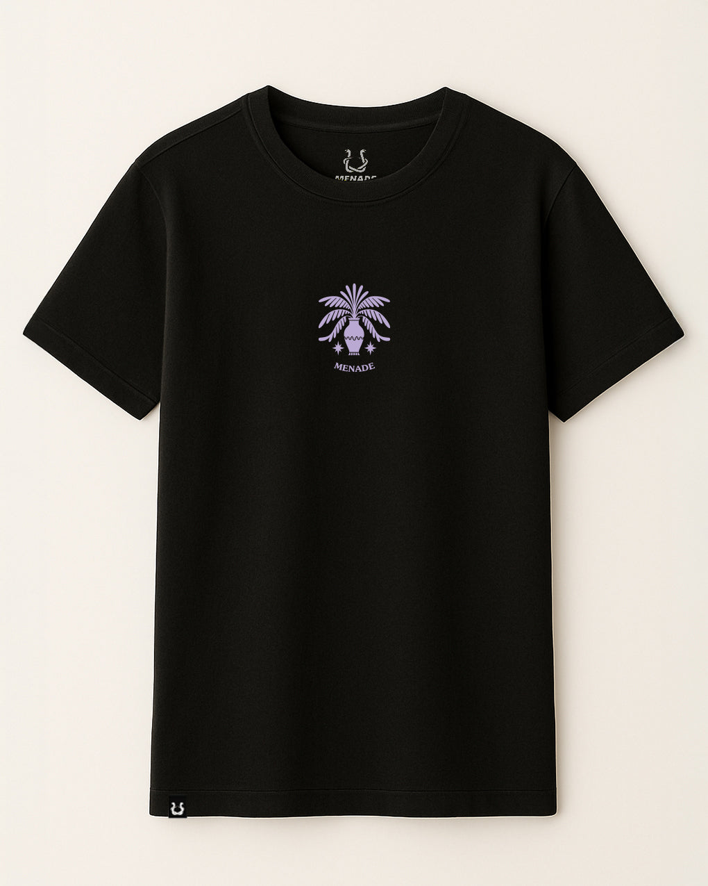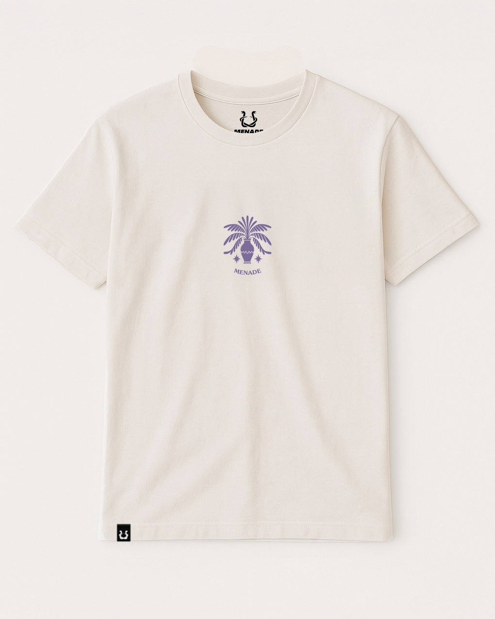 - Front chest print with palm emblem and “MENADE” logotype